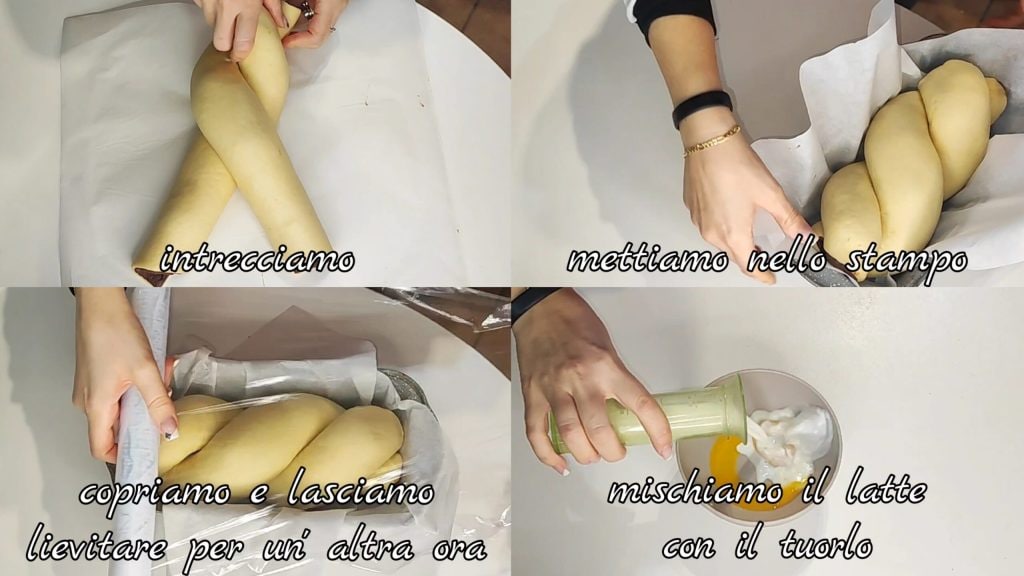 Los trenzamos entre sí. Los colocamos en el molde (el de plumcake) y cubrimos con film transparente, dejamos leudar por una hora más.