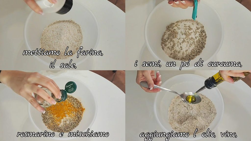 En un recipiente ponemos la harina, la sal, las semillas de girasol, un poco de cúrcuma, romero y mezclamos. Añadimos el aceite, el vino.