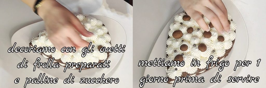 Decoramos con los huevitos de masa preparados y bolitas de azúcar de colores. Os recomiendo prepararla un día antes y mantenerla en el refrigerador hasta antes de servirla.