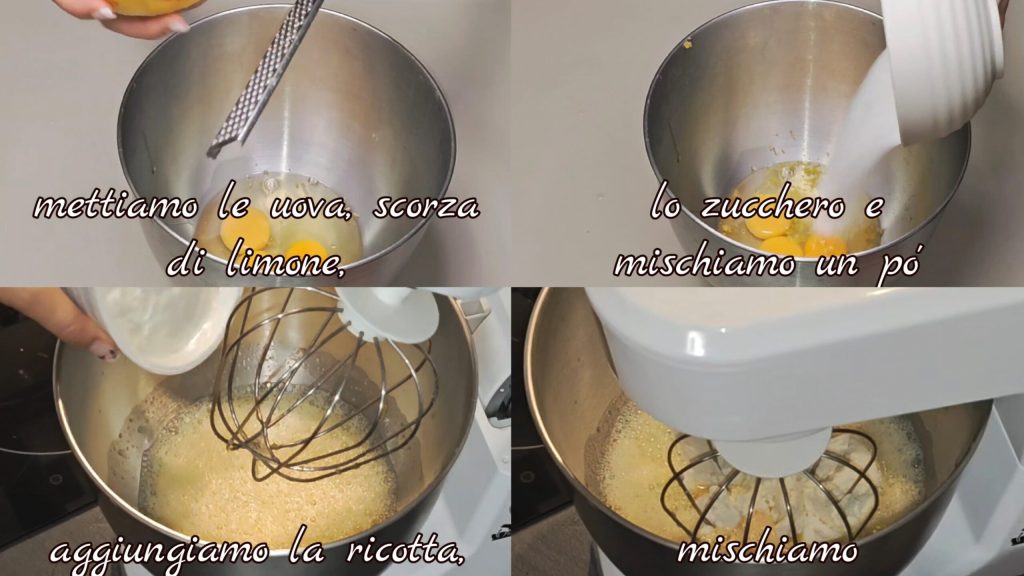 Ponemos los huevos, un poco de cáscara de limón rallada, el azúcar y batimos ligeramente con la batidora eléctrica (no es necesario montarlas). Añadimos la ricotta y mezclamos.