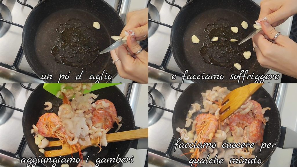 Añadimos un poco de ajo y sofreímos. Añadimos las gambas mixtas y cocinamos durante unos minutos.