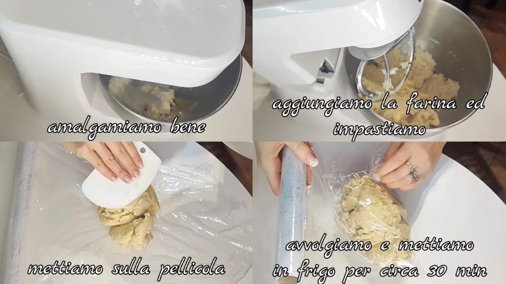 Mezclamos bien. Añadimos la harina y amasamos. Envolvemos la masa en film transparente y la ponemos en la nevera durante unos 30 min.