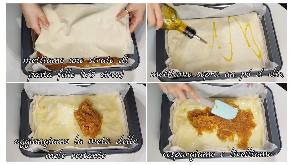 Ponemos otra capa de pasta filo (2/3). Pincelamos con aceite y luego colocamos las manzanas restantes y espolvoreamos bien.