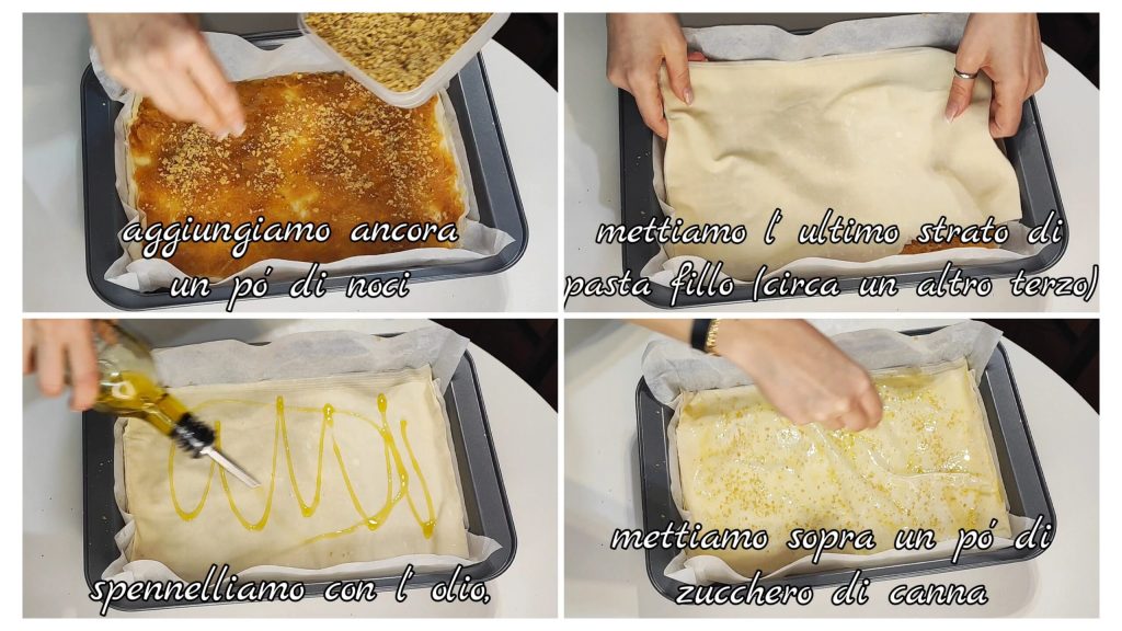 Añadimos más nueces y cubrimos con la pasta filo restante. Pincelamos con aceite y añadimos un poco de azúcar moreno encima.