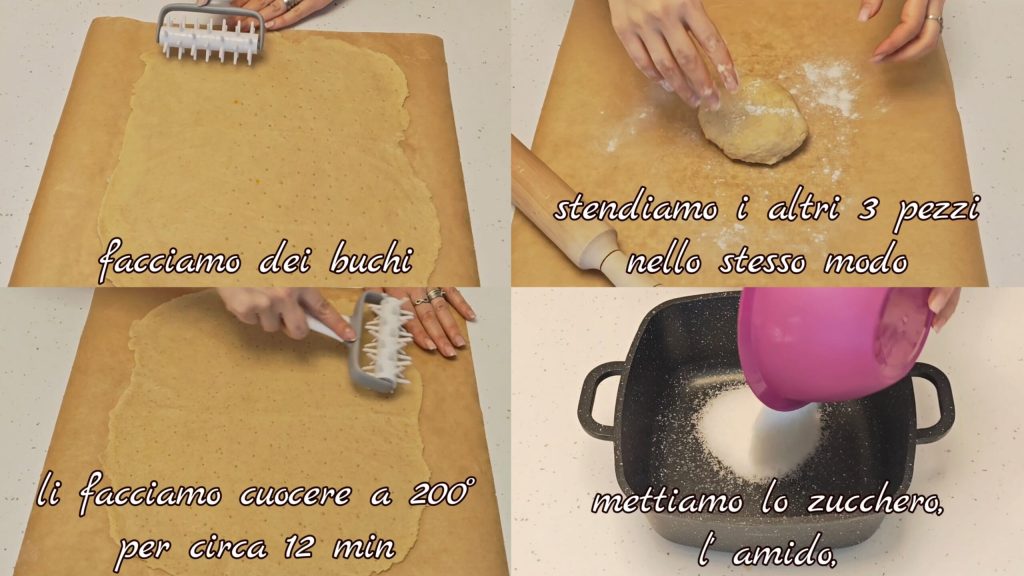 Hacemos agujeros. Extendemos también los otros 3 pedazos de la misma manera. Los horneamos a 200° durante unos 12 min.