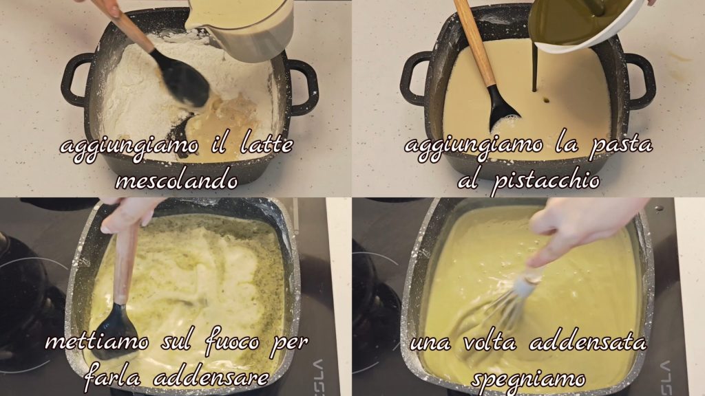 Añadimos la leche y mezclamos. Añadimos la pasta de pistachos y ponemos al fuego para que espese, removiendo siempre. Una vez espesa, apagamos el fuego.