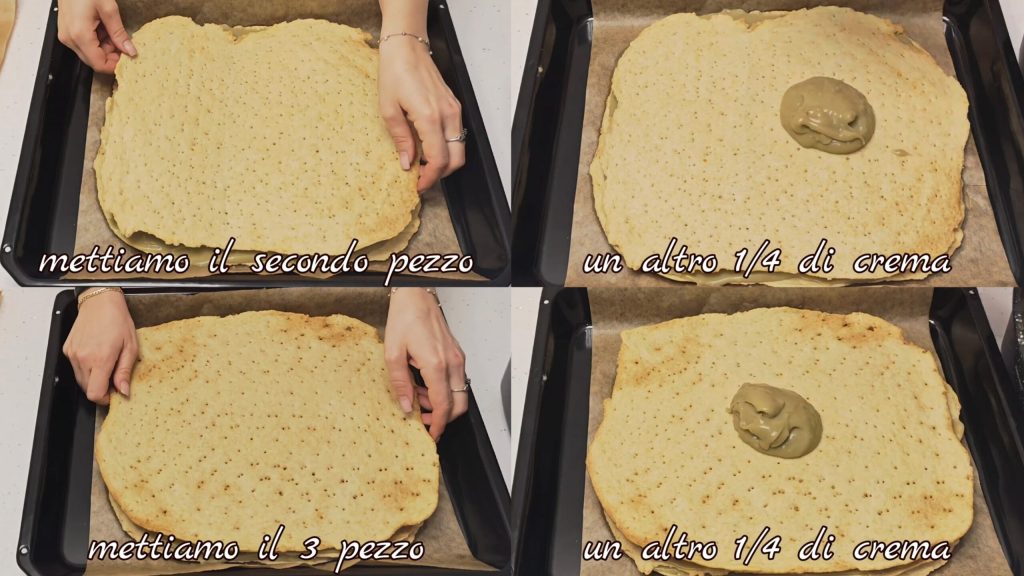 Ponemos el segundo pedazo de masa, otra capa de crema (1/4), el tercer pedazo de masa, otra capa de crema (1/4)