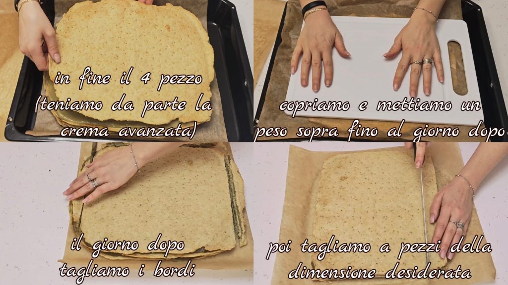 finalmente ponemos el cuarto pedazo de masa y reservamos la crema restante (1/4). Cubrimos y ponemos un peso encima y dejamos reposar hasta el día siguiente. Al día siguiente cortamos los bordes y luego cortamos en piezas del tamaño deseado
