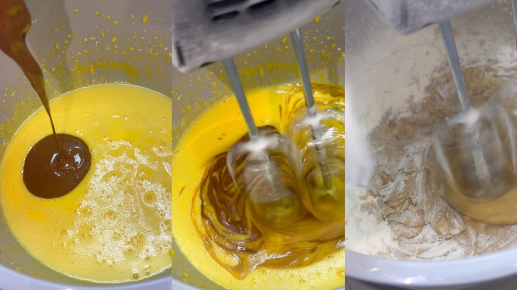 • Añadimos el agua caliente y seguimos batiendo hasta que las yemas estén claras y espumosas. Añadimos el aceite.