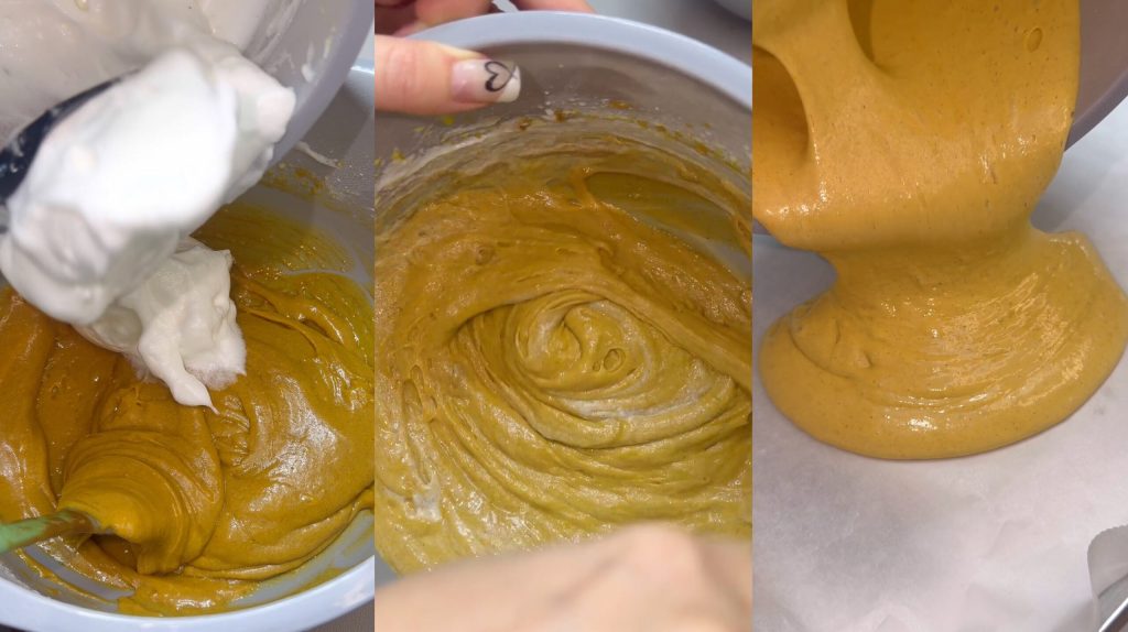 • Incorporamos con delicadeza las claras montadas con movimientos envolventes de abajo hacia arriba. Vertemos la masa en la bandeja forrada con papel de horno.
