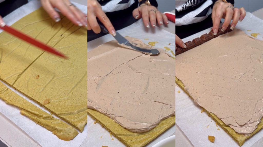 Recortamos los bordes de la base (los usaremos para el efecto mimosa) y los reservamos. Extendemos aproximadamente ¾ de la crema sobre la base ya fría. Añadimos las barritas Kinder Bueno.