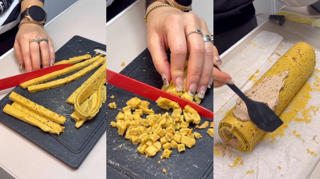 • Mientras tanto cortamos los recortes en cubitos. Recuperamos el rollo y lo cubrimos con la crema restante.
