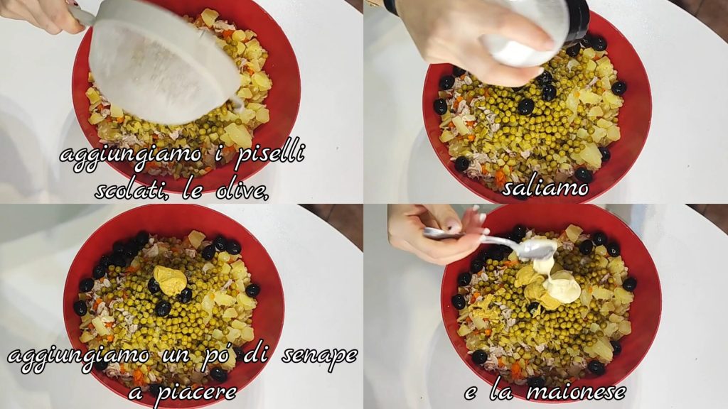 Agregamos los guisantes bien escurridos, las aceitunas deshuesadas, sal al gusto, un poco de mostaza y la mayonesa (con la cantidad réglate poco a poco mientras mezclas y añade más si es necesario, depende de tus gustos).