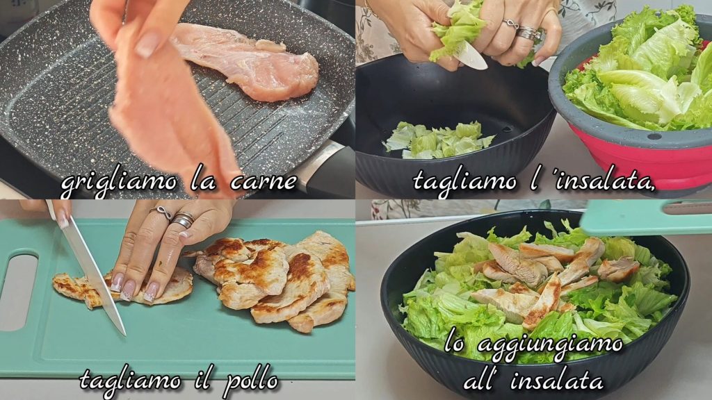 • ¡Primero debemos asar la carne! Mientras tanto, lavamos la ensalada y la cortamos. También cortamos la pechuga de pollo asada y la añadimos a la ensalada.