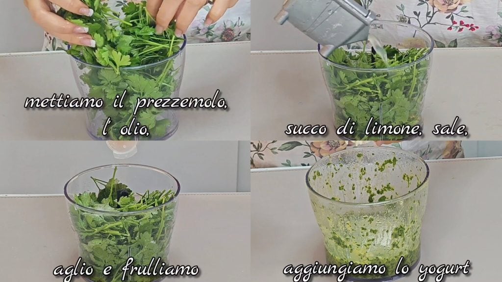 • En una batidora ponemos el perejil, aceite, el zumo exprimido de limón, sal, ajo y batimos. Añadimos el yogur