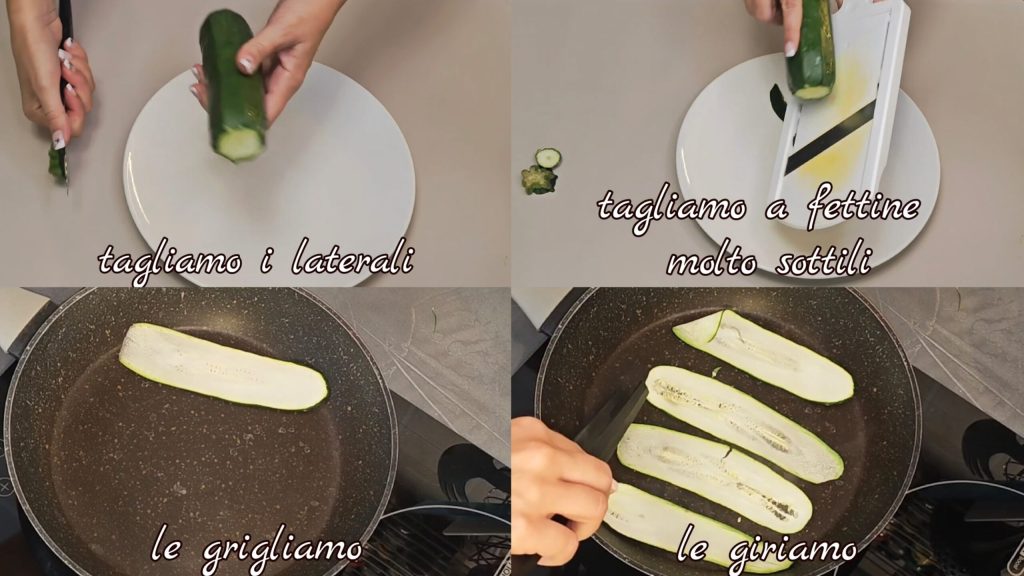 Primero lavamos los calabacines, luego cortamos los laterales y después cortamos en rodajas muy finas usando una mandolina o un pelador. Los asamos durante unos segundos y los dejamos enfriar.
