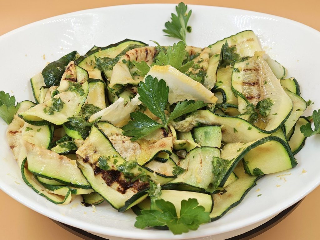 Primero lavamos y cortamos los calabacines en tiras muy finas (os recomiendo un rallador de mandolina), luego los asamos durante unos minutos por ambos lados. Tan pronto como estén listos, los dejamos a un lado. Mientras tanto, preparamos la salsa. En una licuadora ponemos el perejil, aceite de oliva virgen extra, jugo de limón, sal,