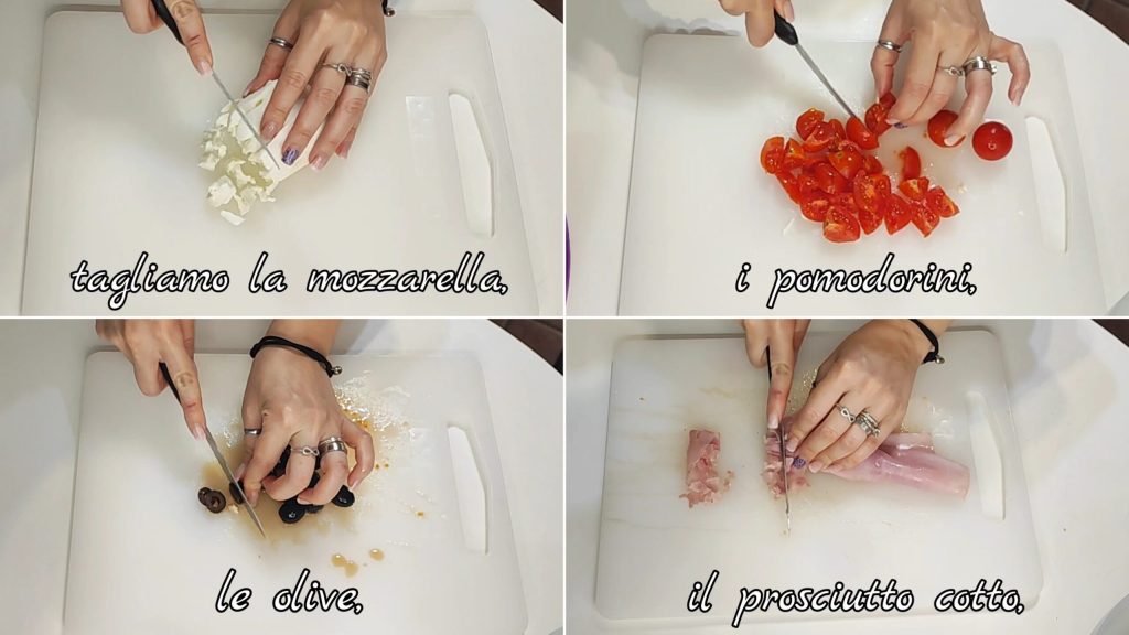 Mientras tanto, cortamos la mozzarella, los tomatitos, las aceitunas y el jamón cocido.