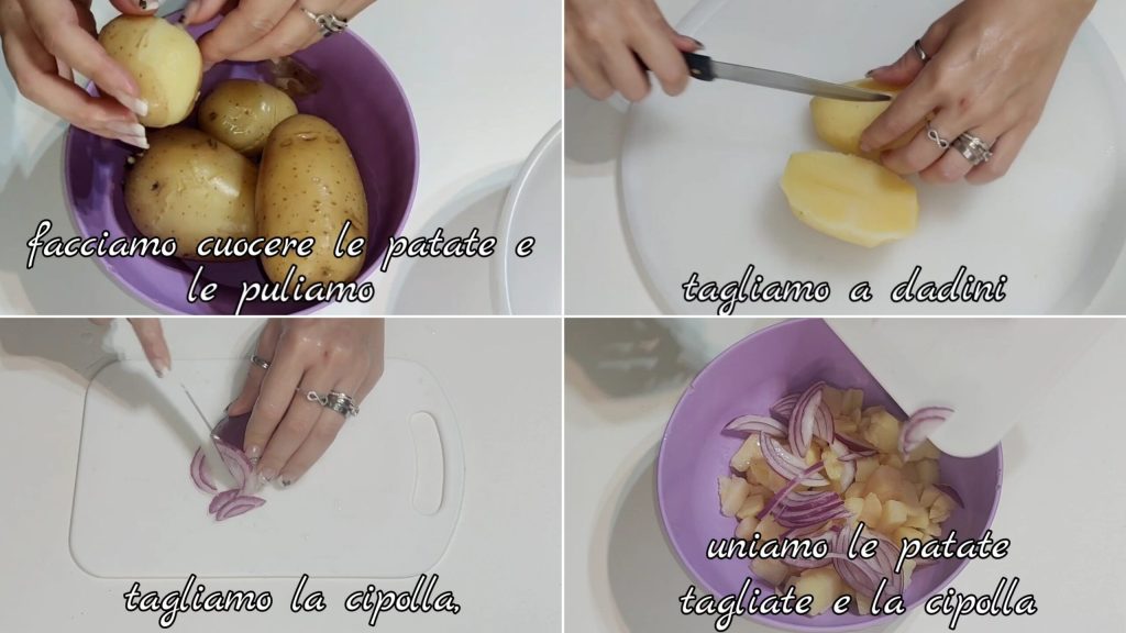 Primero cocemos las patatas y las limpiamos, luego las cortamos en cubitos. Limpiamos, lavamos y cortamos también la cebolla y la añadimos a las patatas.