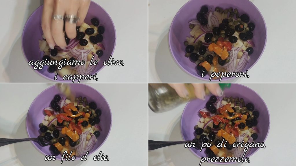 Añadimos las aceitunas, las alcaparras, los pimientos, un chorrito de aceite, un poco de orégano y perejil.