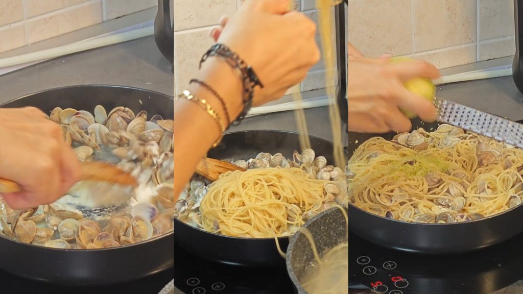 Escurre los espaguetis y saltéalos en la sartén con la crema de ricotta y almejas, añadiendo también la cáscara de limón. Cocina durante 2-3 minutos mezclando bien.