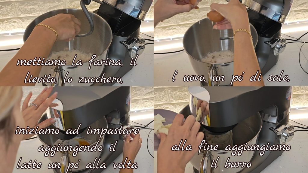 Ponemos la harina, la levadura, el azúcar, el huevo, un poco de sal y comenzamos a amasar añadiendo la leche poco a poco. Al final añadimos la mantequilla.