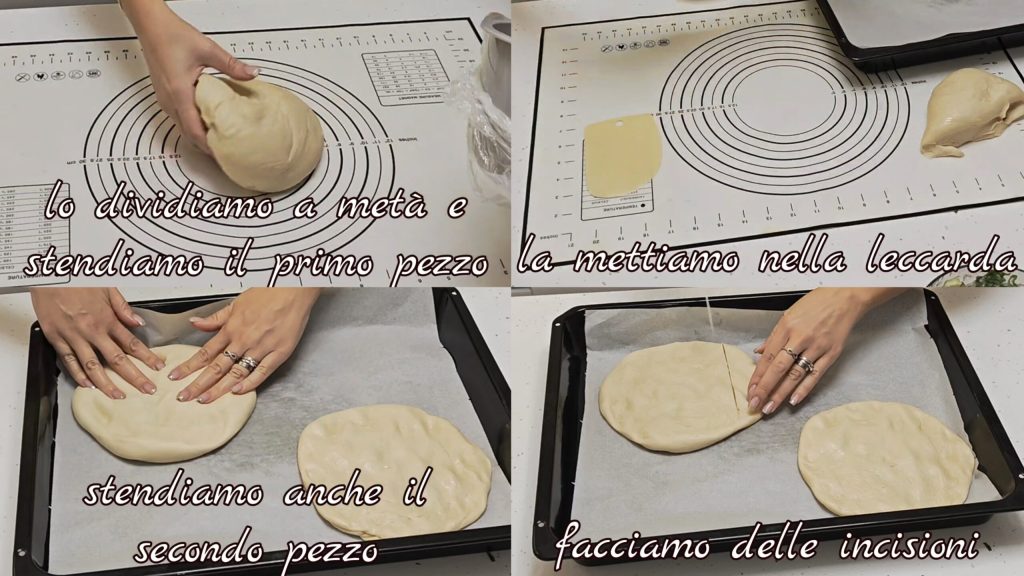 la dividimos a la mitad. Estiramos el primer trozo para darle forma a la focaccia y la ponemos en una bandeja con papel de horno dentro. Estiramos también el segundo trozo y formamos otra focaccia. Hacemos incisiones arriba con un cuchillo.
