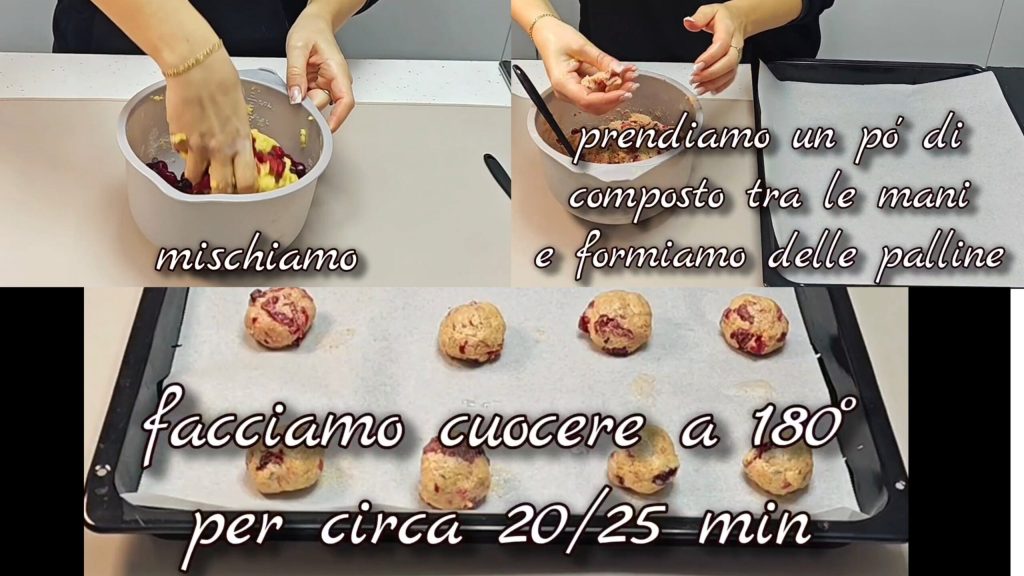 mezclamos. Tomamos un poco de masa a la vez y modelamos con las manos para obtener bolitas. Las colocamos en la bandeja con papel para horno dejando un poco de espacio entre ellas dado que durante la cocción se extenderán. ¡Horneamos a 180° durante unos 20/25 min.