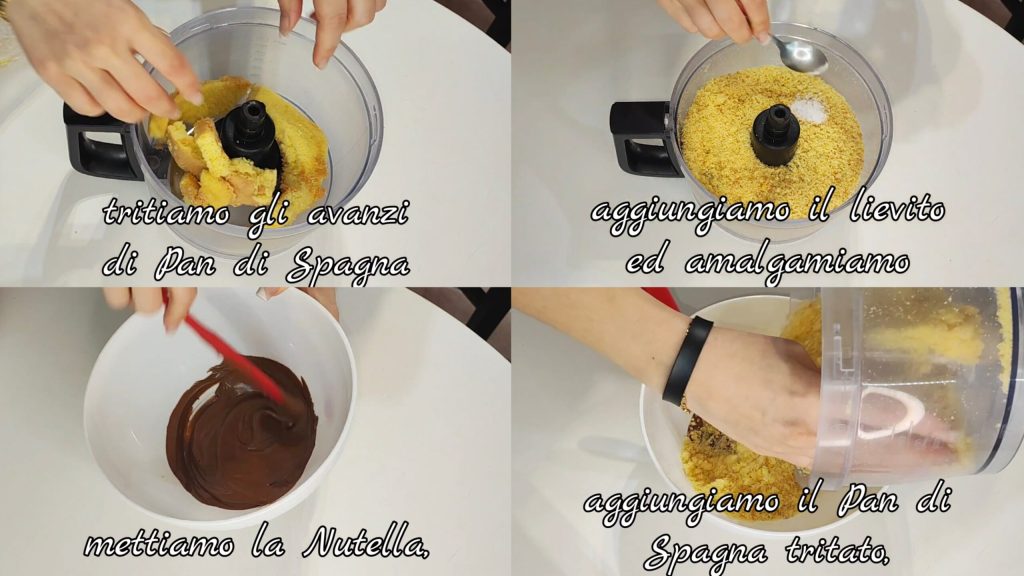 • Primero trituramos los sobrantes de Bizcocho, añadimos la levadura y mezclamos. Ponemos la Nutella y si está muy dura la calentamos un poco y luego añadimos el bizcocho triturado mezclado con la levadura,