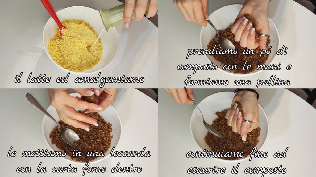• Añadimos la leche y mezclamos. Tomamos un poco de la mezcla y modelamos con las manos para formar bolitas, las ponemos en una bandeja cubierta con papel de horno. Continuamos hasta agotar la mezcla.