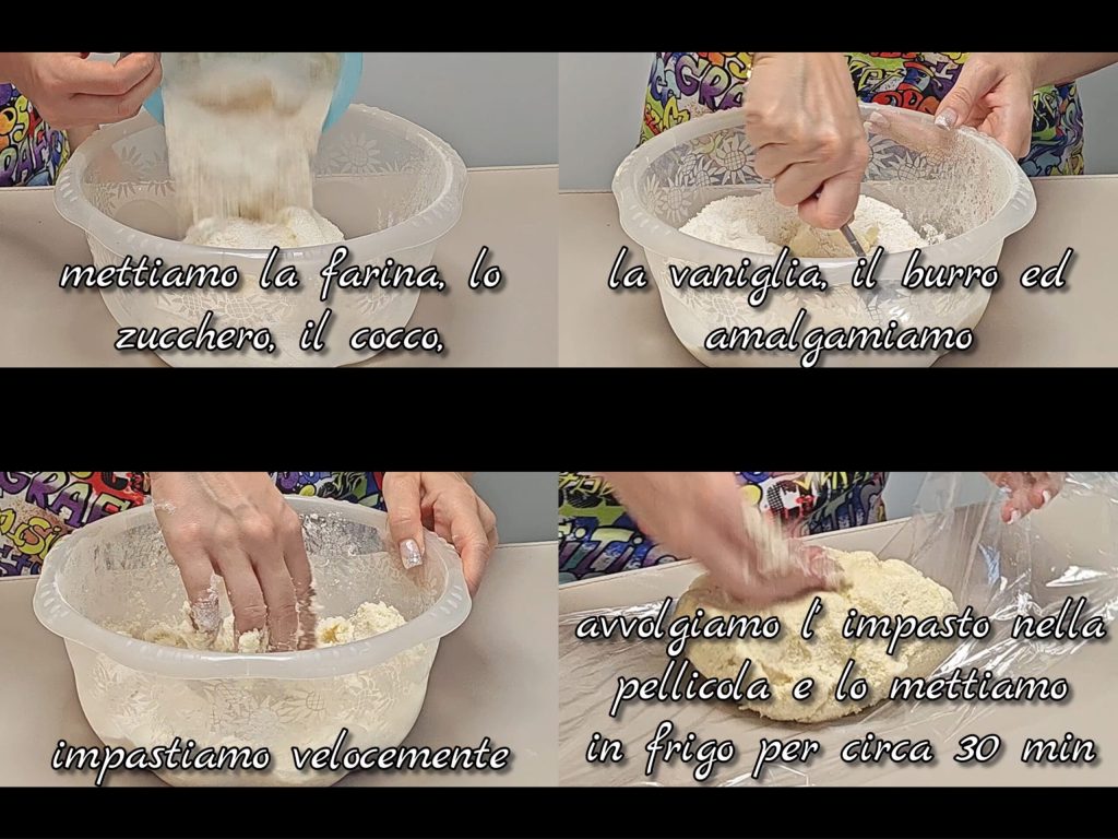 En un recipiente ponemos la harina, el azúcar, el coco, la vainilla y la mantequilla y mezclamos. Amasamos rápidamente hasta obtener una masa homogénea. Envolvemos la masa en film plástico y la metemos en la nevera por unos 30 min.