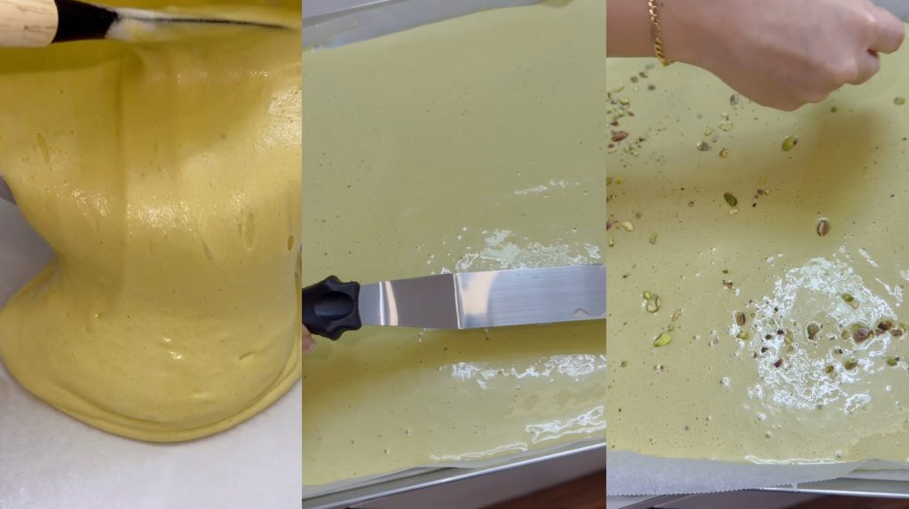 Vertemos la mezcla en la bandeja forrada con papel de horno, alisamos y espolvoreamos con pistachos picados. Horneamos a 180°C durante unos 20 minutos. Sacamos del horno y dejamos enfriar completamente.