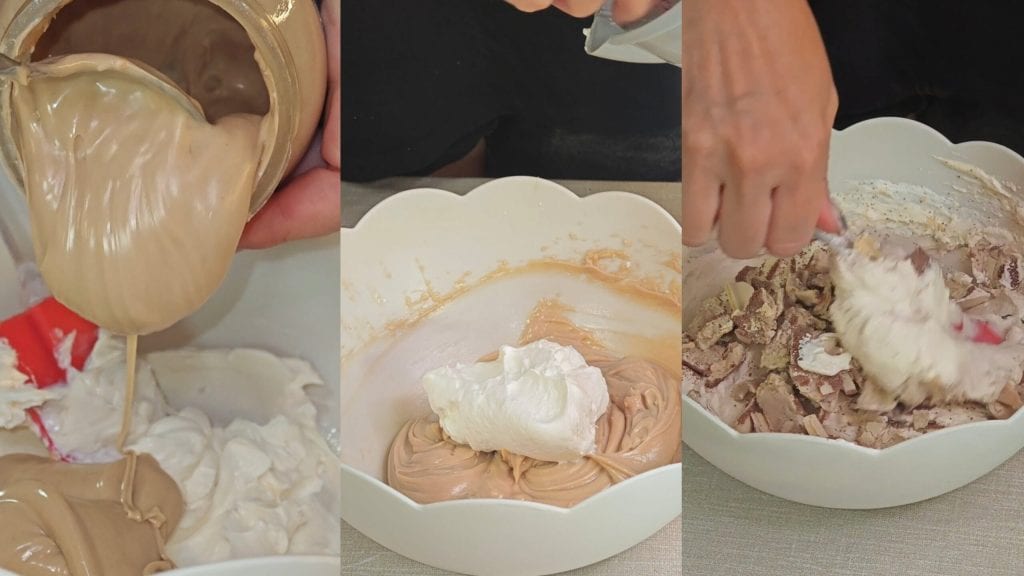 Desmenuza groseramente los Kinder Bueno White y agrégalos a la crema, mezclando con cuidado para distribuirlos uniformementeMontaje de la tarta