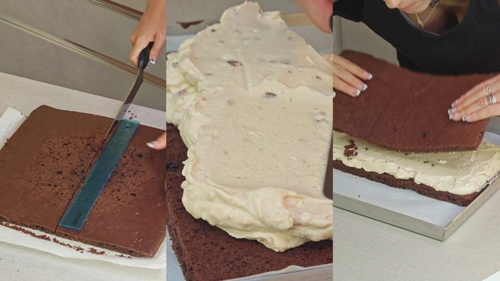 Corta la tarta enfriada por la mitad, horizontalmente, para obtener dos discos.
