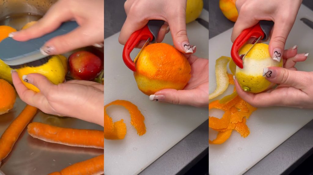 Mientras tanto, pelamos las manzanas y las zanahorias y las picamos junto con la cáscara de los cítricos.