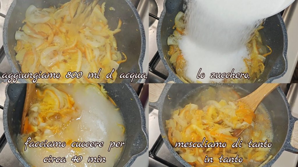 luego añadimos 800 ml de agua, el azúcar y cocinamos durante unos 40 minutos removiendo de vez en cuando.