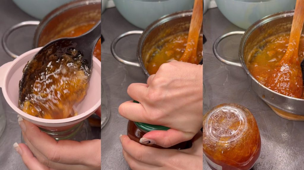 • Cuando alcanza la consistencia deseada, vertemos la mermelada aún caliente en los frascos esterilizados, cerramos bien y volteamos para crear el vacío. Dejamos enfriar completamente.