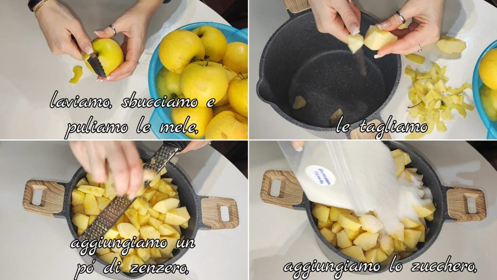 Primero tenemos que limpiar, lavar, pelar y cortar las manzanas. Las ponemos en una cacerola grande, luego agregamos un poco de jengibre rallado al gusto y el azúcar.