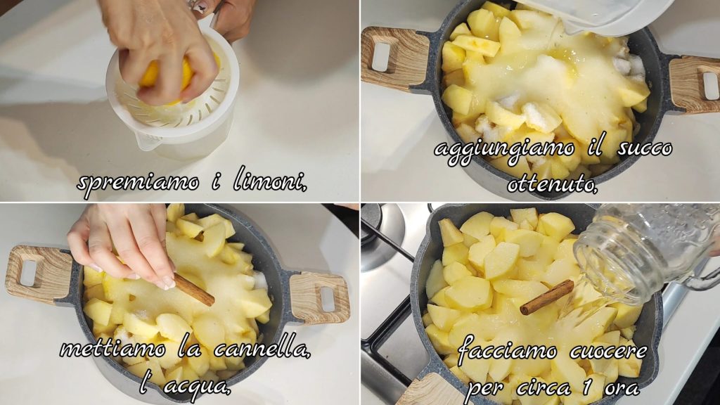 Exprimimos los limones y agregamos el jugo obtenido. Ponemos la canela, el agua, mezclamos y luego cocinamos durante aproximadamente una hora.