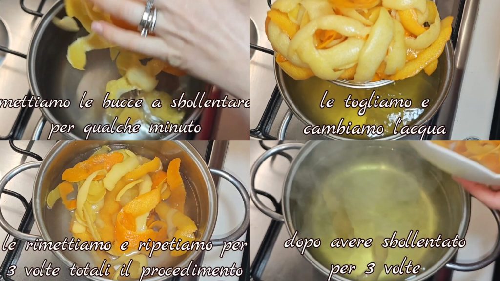 Hervimos las cáscaras por unos minutos, luego las quitamos y cambiamos el agua. Repetimos este procedimiento 3 veces.