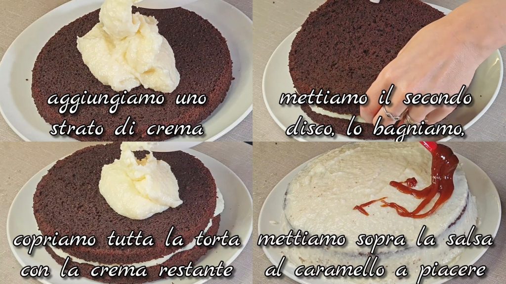 añadimos una capa de crema. Colocamos el segundo disco, lo mojamos y cubrimos con la crema restante. Ponemos encima caramelo al gusto