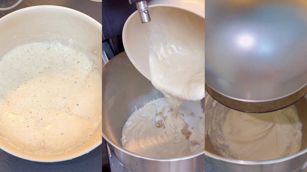 Cuando el prefermento está listo, pongo en un bol la harina, el azúcar, la leche y la levadura restante.