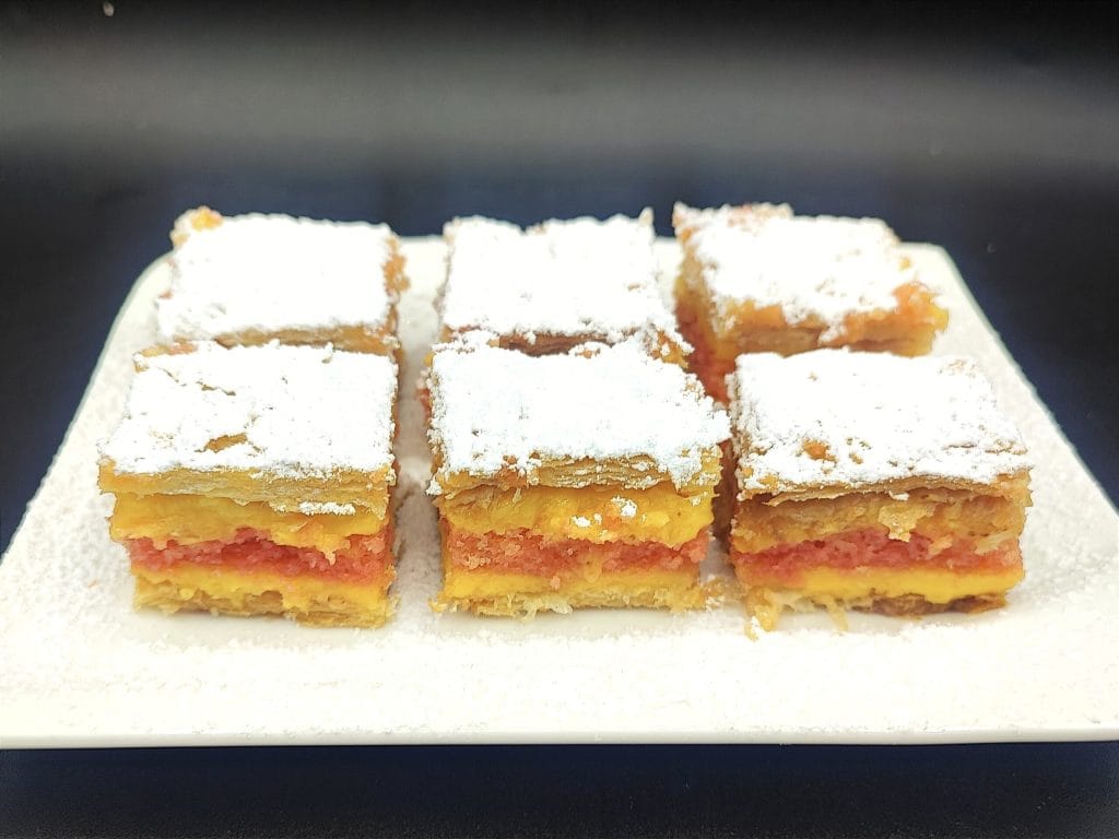 Un gran clásico italiano que nunca falta en las pastelerías, dos capas de hojaldre con dos capas de crema pastelera y en medio bizcocho empapado con alchermes, ¡una delicia! Una receta muy sencilla de preparar pero la dificultad en este caso está en el corte, os he mostrado en el vídeo mi método para cortar de forma más sencilla el diplomático!