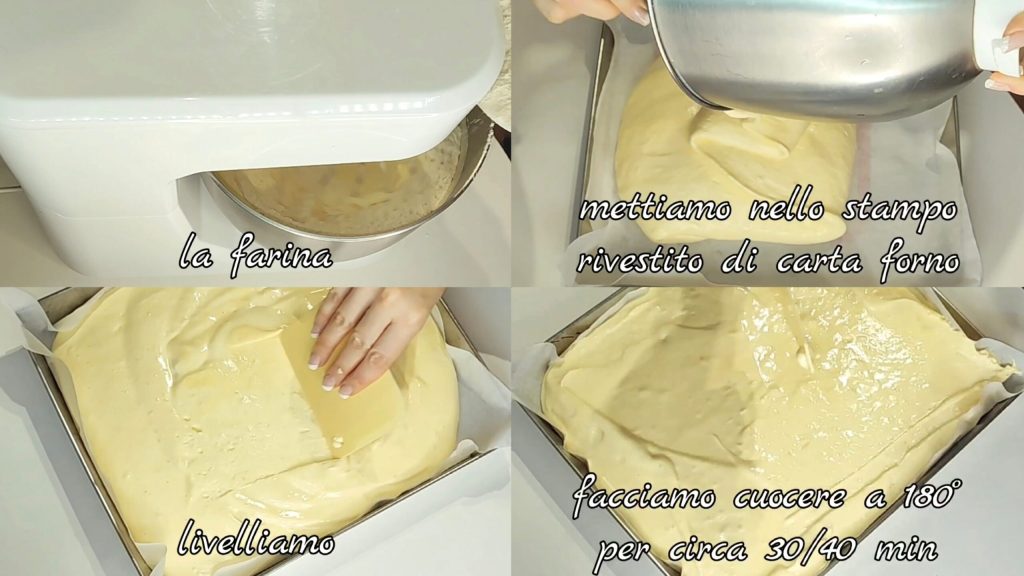 Añadimos la harina tamizada. Ponemos la mezcla obtenida en un molde forrado con papel de horno, nivelamos y cocinamos durante unos 30/40 min.
