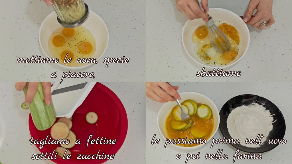 En un recipiente ponemos los huevos, especias al gusto y batimos. Cortamos los calabacines limpios y lavados en rodajas finas usando una mandolina. Pasamos las rodajas primero por el huevo y luego por la harina.