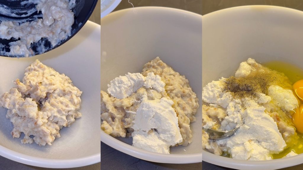 Cuando el grano esté frío añado la ricotta y los huevos.