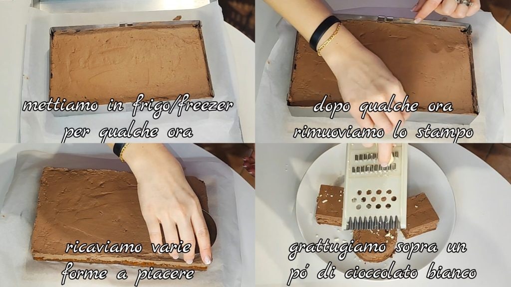 Ponemos en la nevera por unas horas. Después de unas horas quitamos el aro ajustable y recortamos varias formas al gusto. Decoramos con un poco de chocolate blanco rallado.
