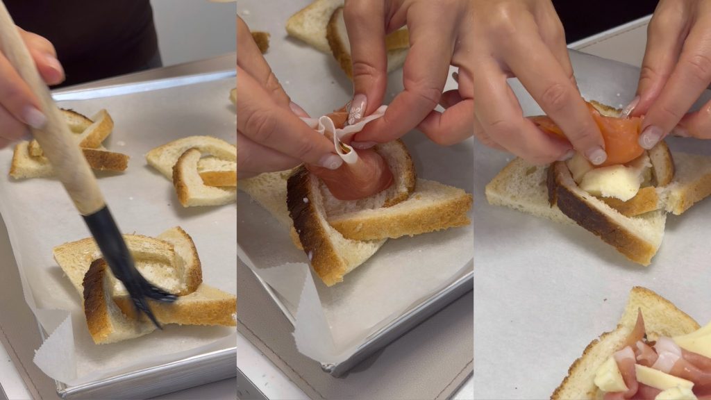 • Toma las rebanadas de pan blanco para sándwiches y corta cuadrados de aproximadamente 11×11 cm, manteniéndote ligeramente alejado del borde.