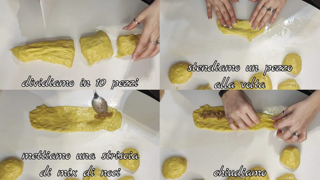 La dividimos en 10 piezas. Estiramos una pieza a la vez en largo (mira el video) y ponemos en el centro una tira de la mezcla de nueces. Cerramos.
