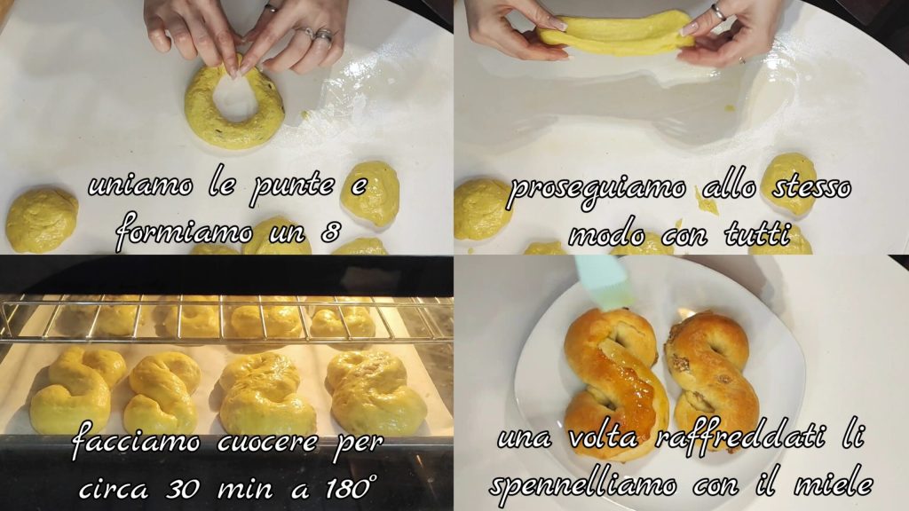 luego unimos las dos puntas y formamos un 8. Procedemos de la misma manera con todos. Horneamos a 180° por unos 30 min. Una vez enfriados los pincelamos con la miel